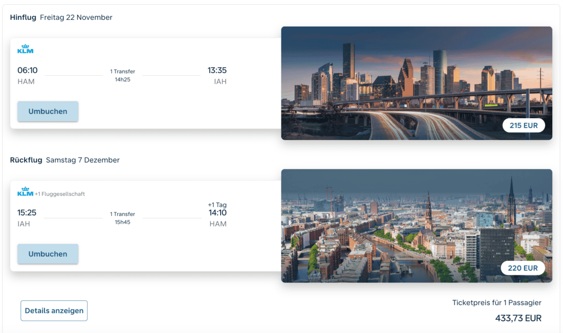 Die Kreuzfahrt startet und endet in Galveston, wobei der nächstgelegene Flughafen Houston ist. Eine günstige Möglichkeit für die An- und Abreise sind Flüge ab Hamburg mit KLM. Bei Hinflug am 22. November und Rückflug am 7. Dezember 2024 zahlt ihr momentan 434€ (zzgl. 125€ für 23 kg Aufgabegepäck):