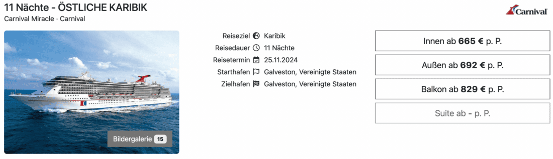 Die Carnival Miracle der US-Reederei Carnival wird Ende November 2024 auf einer Kreuzfahrt in die östliche Karibik eingesetzt. Die Reise startet und endet in Galveston im US-Bundesstaat Texas. Für 11 Nächte in einer Balkonkabine zahlt ihr aktuell nur 829€ pro Person. Diese Kategorie hat somit das beste Preis-Leistungs-Verhältnis, ihr könnt aber auch Innenkabinen ab 665€ sowie Außenkabinen ab 692€ (jeweils pro Person bei Doppelbelegung) buchen.