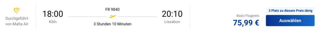 Die Kreuzfahrt startet in Lissabon und endet in Dover. Für die Anreise nach Portugal könnt ihr den Direktflug mit Ryanair von Köln nach Lissabon am 10. Mai 2025 nutzen. Diese Verbindung ist momentan ab 76€ (zzgl. 33€ für 20 kg Aufgabegepäck) buchbar: