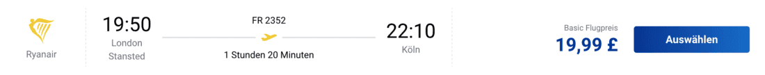 Nach Ankunft in Dover bietet sich optional noch ein Landaufenthalt in der Region oder ein Städtetrip nach London an. Einen günstigen Rückflug gibt es mit Ryanair am 19. Mai 2025 von London-Stansted nach Köln. Hier zahlt ihr aktuell 20 £ (~23 €) (zzgl. 27 £ (~31 €) für 20 kg Aufgabegepäck):