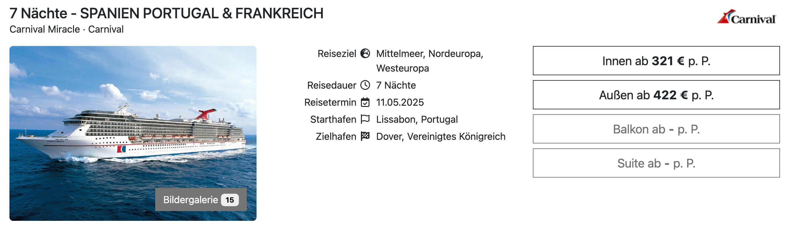 Die Carnival Miracle der US-Reederei Carnival fährt im Mai 2025 von Lissabon nach Dover. Aktuell könnt ihr euch diese Positionierungskreuzfahrt zum besonders günstigen Preis sichern. 7 Nächte in einer Innenkabine sind bereits ab 321€ pro Person buchbar.