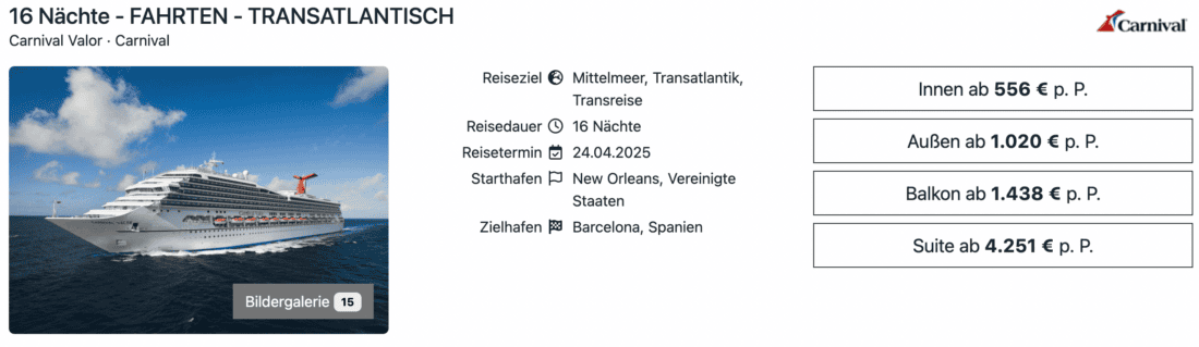 Die Carnival Valor der US-Reederei Carnival wird im April 2025 von New Orleans nach Barcelona überführt. Die Kreuzfahrt über den Atlantik wird aktuell bereits zu günstigen Tarifen angeboten. Für 16 Nächte in der Innenkabine zahlt ihr lediglich 556€ pro Person. Falls euch diese Variante nicht ausreicht, stehen alternativ die Außenkabinen ab 1.052€ sowie Balkonkabinen ab 1.558€ (jeweils pro Person bei Doppelbelegung) zur Verfügung.