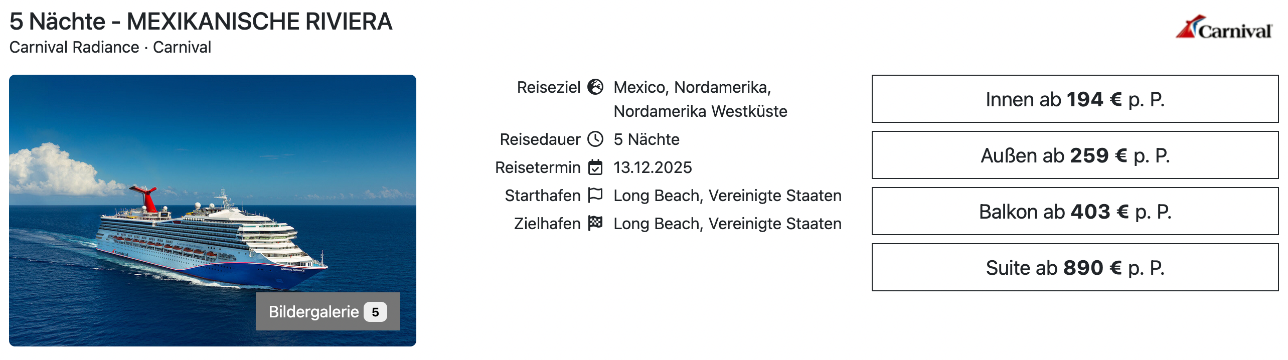 Neben der hier vorgestellten Abfahrt gibt es noch einige weitere Abfahrten mit der Carnival Radiance ab Los Angeles, die ihr momentan günstig buchen könnt: