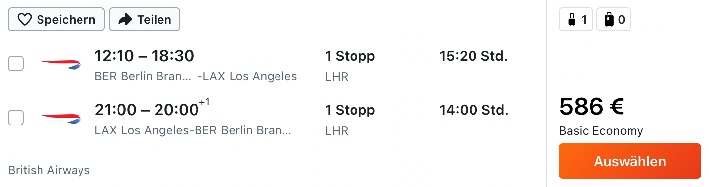 Für die Anreise nach Florida könnt ihr etwa die Verbindungen mit British Airways ab Berlin nutzen. Bei Hinflug am 11. Dezember und Rückflug am 18. Dezember 2025 zahlt ihr momentan 586€ (zzgl. ca. 135€ für Aufgabegepäck):