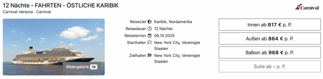 Die Carnival Venezia der US-Reederei Carnival ist im kommenden Herbst ab New York auf verschiedenen Kreuzfahrten mit Zielen in der Karibik im Einsatz. Aktuell lohnt sich eine Buchung besonders, denn die Preise sind erstaunlich niedrig. Eine Innenkabine ist bereits ab 617€ pro Person buchbar. Außerdem könnt ihr euch Außenkabinen ab 864€ sowie Balkonkabinen ab 968€ (jeweils pro Person bei Doppelbelegung) sichern. Für Alleinreisende sind Innenkabinen ab 1.125€ momentan die günstigste Option.