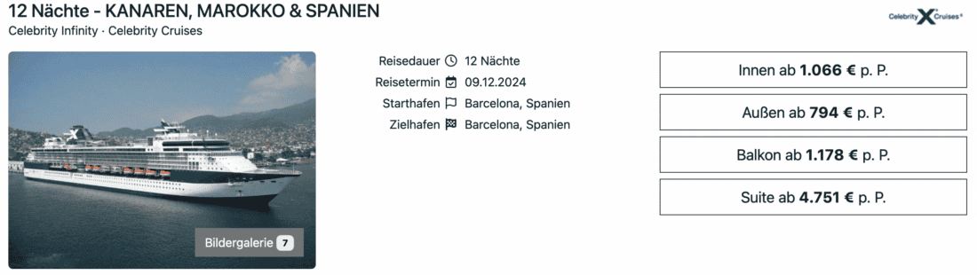 Die Celebrity Infinity der US-Reederei Celebrity Cruises wird Anfang Dezember ab Barcelona zu einer Kreuzfahrt in Richtung Kanaren und Marokko eingesetzt. Aktuell könnt ihr euch für diese Reise zu preiswerten Konditionen sichern. Die 12 Nächte sind in einer Außenkabine bereits ab 704€ pro Person buchbar. Weitere Optionen für diese winterliche Auszeit im Süden sind Innenkabinen ab 1.066€ sowie Balkonkabinen ab 1.178€ (jeweils pro Person bei Doppelbelegung).