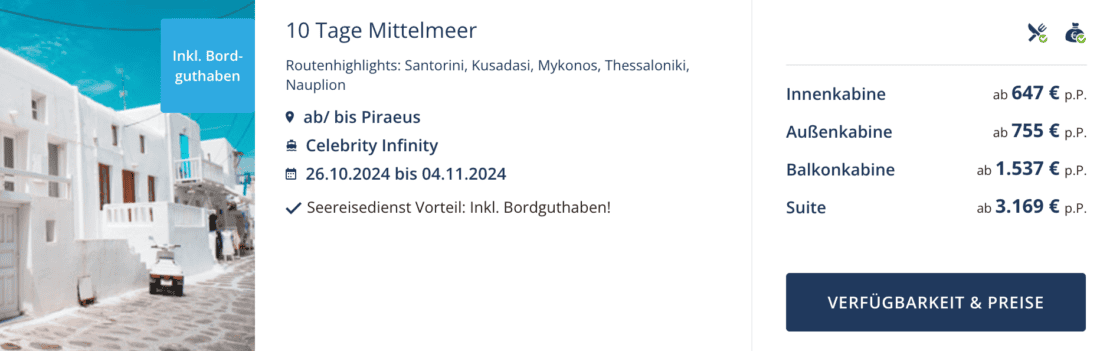 Habt ihr in diesem Herbst Lust auf eine Auszeit im Mittelmeer? Dann könnte diese Kreuzfahrt mit der Celebrity Infinity perfekt für euch geeignet sein. Das Schiff der Reederei Celebrity Cruises fährt Ende Oktober ab Piräus zu vielen Zielen in Griechenland und macht auch einen Abstecher in die Türkei. Für 9 Nächte zahlt ihr in einer Innenkabine aktuell nur 647€ pro Person. Weitere Optionen sind Außenkabinen ab 755€ sowie Balkonkabinen ab 1.537€ (jeweils pro Person bei Doppelbelegung).