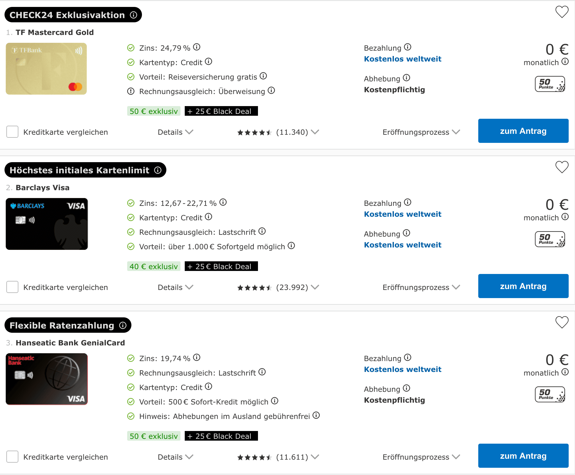 Bei Check24 gibt es als Black Deal eine Gutschrift über 25€, wenn ihr bis zum 2. Dezember 2024 23:30 eine Kreditkarte beantragt und erfolgreich ausgestellt bekommt. Die Aktion ist mit weiteren exklusiven Aktionen kombinierbar. So gibt es für die Hanseatic GenialCard oder TF Mastercard Gold insgesamt 75€. Für das C24 Smart inkl. Debit-Karte insgesamt 100€ und für das Barclays Platinum Double sogar 125€.