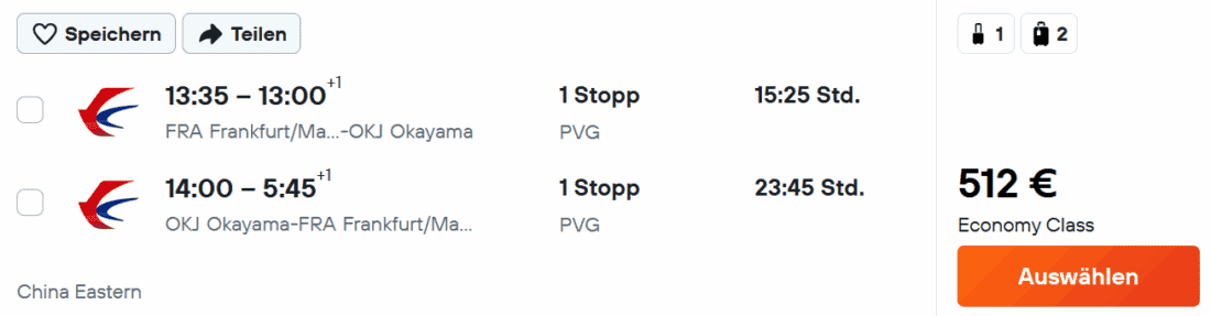 Die Tickets werden in Buchungsklasse Z ausgestellt. Folgende Gutschriften gibt es demnach (Beispiel nach Okayama):
