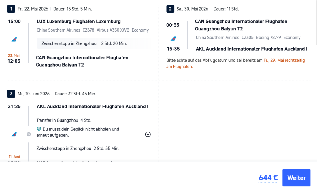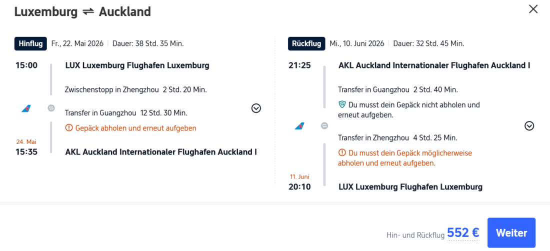 Neben dem Angebot nach Bangkok ab ca. 410€ geht es mit China Southern auch zu fairen Preisen von Luxemburg nach Down Under. Von März bis Mai 2026 (d.h. Herbst in Ozeanien) könnt ihr so ab 552€ nach Neuseeland oder Australien fliegen.