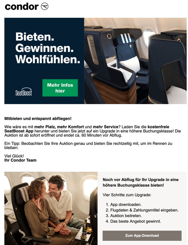 Früh morgens am Abflugtag erhielt ich dann eine Mail, dass man für 449 EUR/Strecke auf die Business Class upgraden könne.