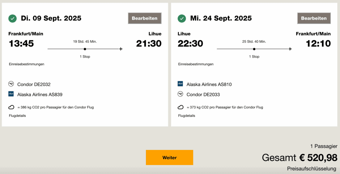 Wir sagen ja nicht, dass man auf allen Strecken mit Hawaiian fliegen kann. Nach Lihue bietet Condor offenbar nur Flüge mit Alaska an. Und über Vancouver geht es nur mit Westjet, nicht mit Hawaiian.