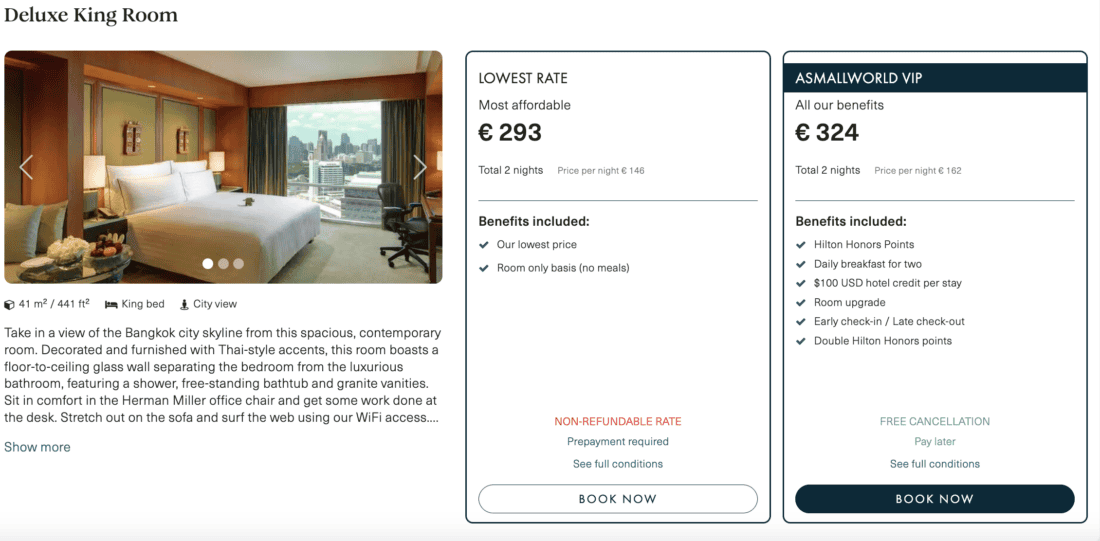 Bei Conrad handelt es sich um eine der luxuriösesten Hotelmarken von Hilton. In Bangkok könnt ihr das dortige Conrad Hotel für 162€ pro Nacht buchen. Bei einer Buchung über die Webseite von ASMALLWORLD sind dabei das Frühstück, 100 $ (~86 €) Hotelguthaben, ein kostenfreies Zimmerupgrade und doppelte Punkte bei Hilton Honors enthalten. Die Rate ist sogar vollständig erstattbar. Die einzige Einschränkung ist, dass ihr mindestens 2 Nächte buchen müsst, um den günstigsten Preis zu erhalten.