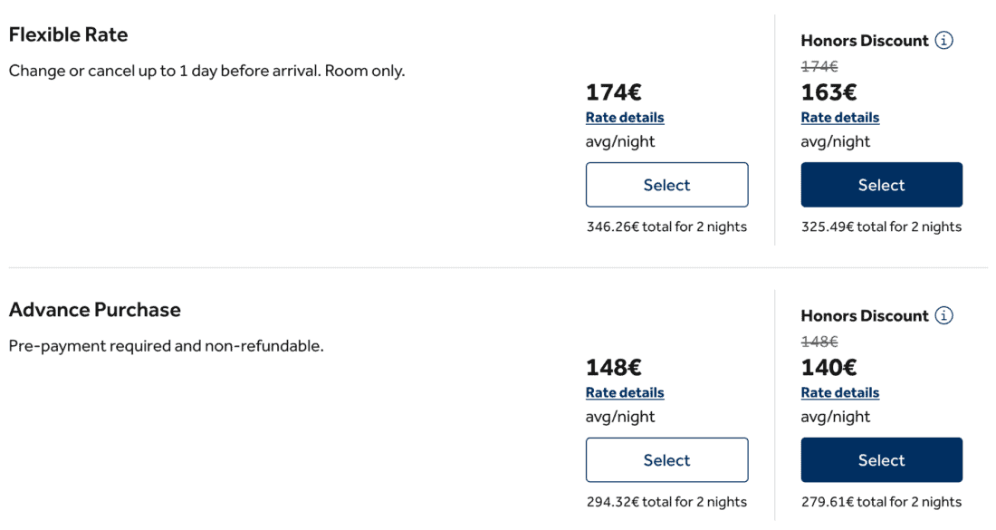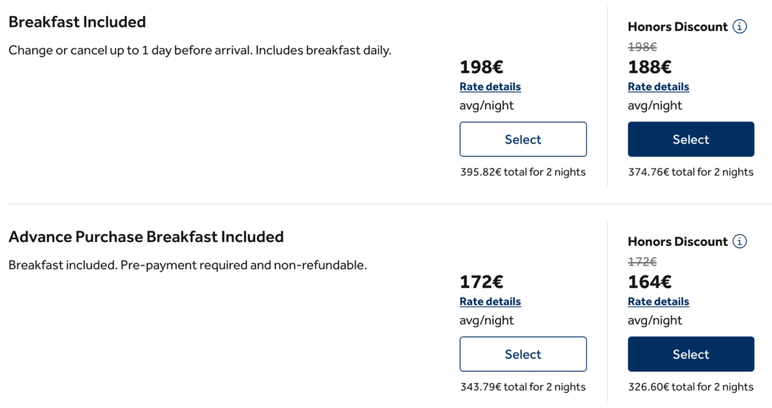 Nimmt man in diesem Fall also die stornierbare Rate von Hilton inklusive Frühstück als Vergleichsbasis, so würdet ihr ca. 13,5% sparen. Zusätzlich erhaltet ihr aber die weiteren Vorteile (100 US-Dollar Hotelguthaben, tägliches Frühstück, Zimmerupgrade sowie Early Check-in und Late Check-out (je nach Verfügbarkeit)).
