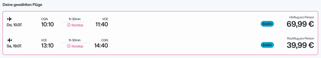 Die Kreuzfahrt startet und endet in Marghera (bei Venedig). Günstige Flüge gibt es etwa mit Eurowings von Köln, wobei der Hinflug am 10. Juli und der Rückflug am 19. Juli 2025 stattfindet. Diese Kombination ist aktuell ab 110€ (zzgl. insgesamt 48€ für 23 kg Aufgabegepäck) buchbar: