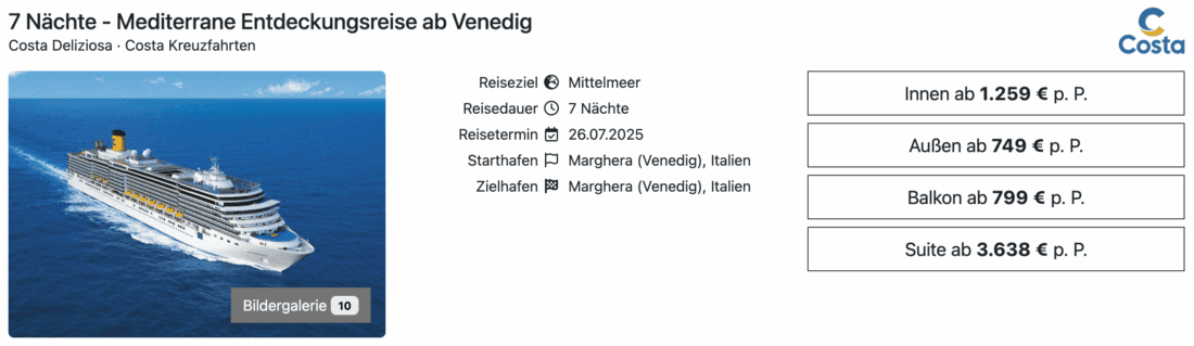 Ihr seid spontan und möchtet noch im Juli günstig eine Kreuzfahrt im Mittelmeer erleben? Das ist dank attraktiver Last-Minute-Angebote von Costa kein Traum, sondern die Realität. Die Costa Deliziosa startet am 26. Juli 2025 zu einer einwöchigen Reise im östlichen Mittelmeer mit Start und Ziel in Marghera (bei Venedig).