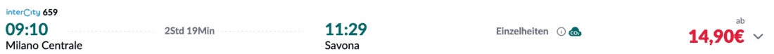 Für die Weiterfahrt von Mailand nach Savona könnt ihr anschließend die Züge der italienischen Bahngesellschaft Trenitalia nutzen. Tickets im Fernverkehr gibt es bereits ab 15€ pro Person und Strecke: