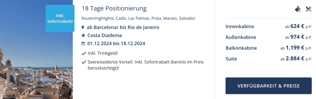 Die Costa Diadema wird nach ihrer Sommersaison mit regelmäßigen Abfahrten ab Kiel im kommenden Winter wieder in Südamerika eingesetzt. Die Positionierungskreuzfahrt von Barcelona nach Rio de Janeiro findet Anfang Dezember 2024 statt und ist günstig buchbar. Für die 17 Nächte an Bord zahlt ihr in einer Innenkabine momentan nur 624€ pro Person. Außenkabinen stehen ab 974€ sowie Balkonkabinen ab 1.199€ zur Verfügung (jeweils pro Person bei Doppelbelegung).