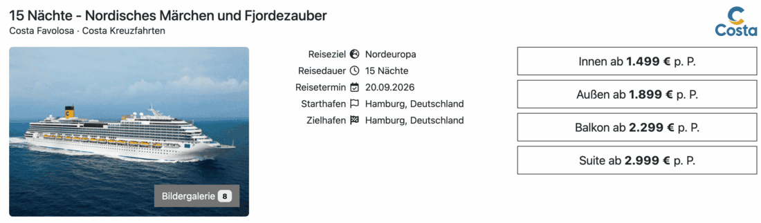 Ihr möchtet euch gerne frühzeitig vorausplanen, was eure nächste Kreuzfahrt oder seid aufgrund einer langfristigen Urlaubsplanung sogar dazu gezwungen, lange im Voraus zu buchen? Dann solltet ihr euch dieses Angebot genauer anschauen. Die Costa Favolosa fährt im September 2026 auf einer längeren Route von Hamburg zunächst nach Schottland, anschließend nach Norwegen und danach wieder zurück in die Hansestadt.