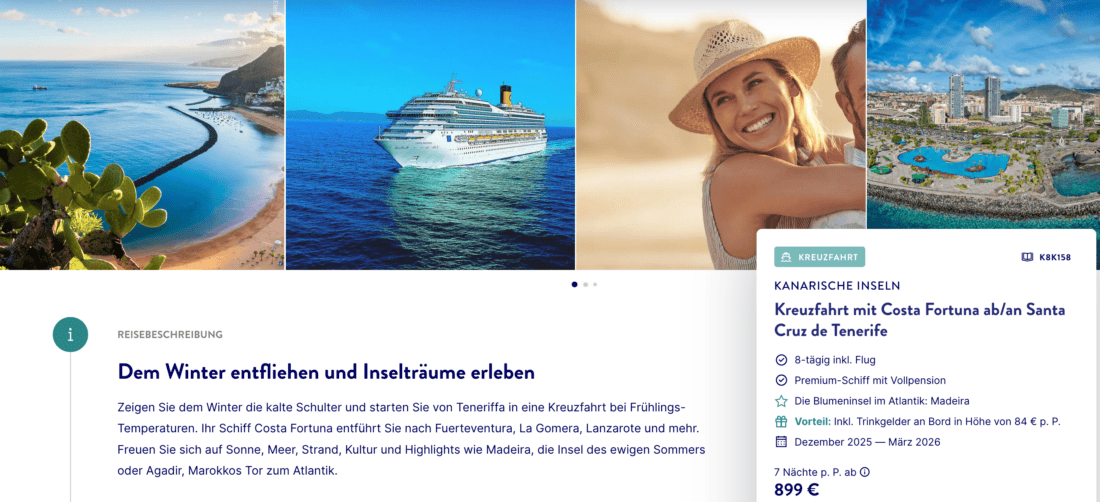 Die Costa Fortuna ist in der Wintersaison 2025/2026 auf verschiedenen Kreuzfahrten rund um die Kanarischen Inseln und Madeira unterwegs. Bei Aldi Reisen könnt ihr euch aktuell den günstigsten Termin bereits ab 899€ pro Person in einer Innenkabine sichern.