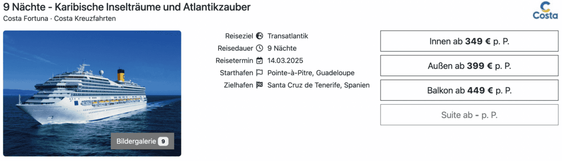Die Costa Fortuna wird in Kürze die Karibik verlassen und zur Rückfahrt in Richtung Europa in See stechen. Falls ihr spontan Zeit habt, so könnt ihr euch die Überfahrt von Guadeloupe nach Teneriffa jetzt zum Schnäppchenpreis sichern, denn 9 Nächte in der Innenkabine sind bereits ab 349€ pro Person buchbar. Ebenfalls sehr attraktiv sind die Tarife für Außenkabinen ab 399€ bzw. Balkonkabinen ab 449€ (jeweils pro Person bei Doppelbelegung). Es kommt noch besser, denn für Alleinreisende fällt auf dieser Kreuzfahrt kein Zuschlag an.