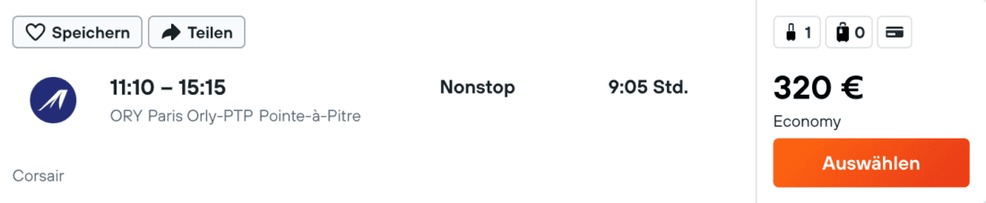 Die Kreuzfahrt startet in Pointe-à-Pitre auf Guadeloupe und endet auf Teneriffa. Für die Anreise in die Karibik sind Direktflüge ab Paris-Orly deutlich günstiger als ein Flug ab Deutschland. So könnt ihr beispielsweise am 6. März 2025 mit Corsair nonstop ab 320€ (zzgl. ca. 50€ für Aufgabegepäck) nach Guadeloupe fliegen: