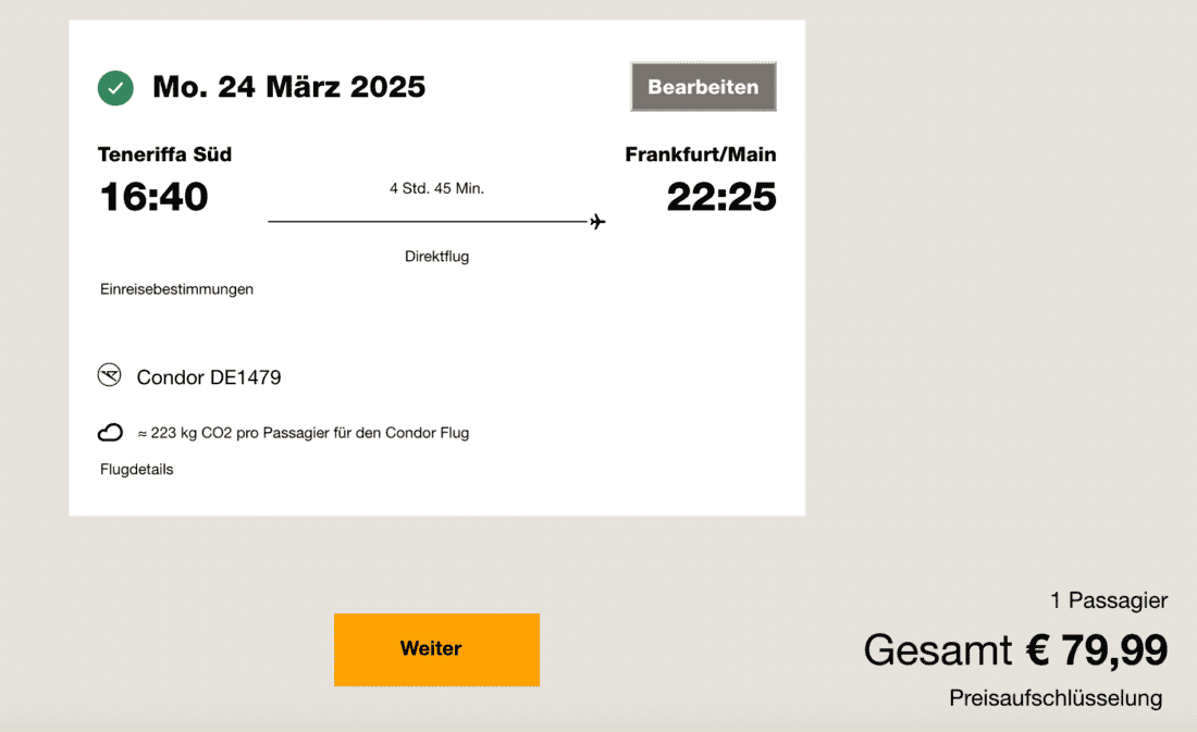 Nach Ende der Kreuzfahrt könnt ihr von Teneriffa am 24. März 2025 günstig mit Condor nach Frankfurt fliegen. Dieser Flug ist aktuell ab 80€ (zzgl. 40€ für 20 kg Aufgabegepäck) buchbar: