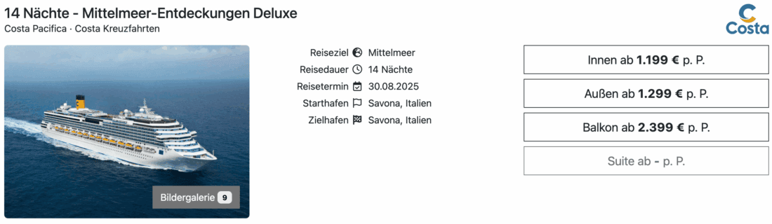 Seid ihr kurzfristig noch auf der Suche nach einer Kreuzfahrt in diesem Sommer? Dann haben wir heute das passende Angebot für euch, denn mit der Costa Pacifica könnt ihr bereits am 30. August 2025 zu einer zweiwöchigen Kreuzfahrt ab/bis Savona in See stechen. Auf dieser Route gibt es neben den Klassikern im Mittelmeer auch Zwischenstopps etwa in La Seyne-sur-Mer oder in Olbia auf Sardinien.