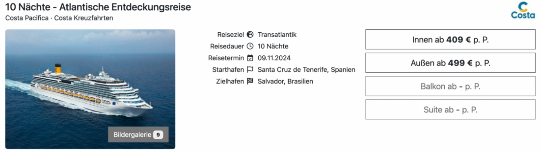Die Costa Pacifica wechselt für die kommende Wintersaison ihr Einsatzgebiet und wird aus diesem Grund von Europa nach Brasilien überführt. Aktuell könnt ihr die Atlantiküberquerung von Teneriffa nach Rio de Janeiro mit einer Dauer von 10 Nächten bereits ab 409€ in einer Innenkabine buchen. Für die günstigste Außenkabine werden 499€ fällig (jeweils pro Person bei Doppelbelegung). Ihr solltet dabei aber zeitlich flexibel sein, denn die Kreuzfahrt beginnt bereits am 9. November 2024.