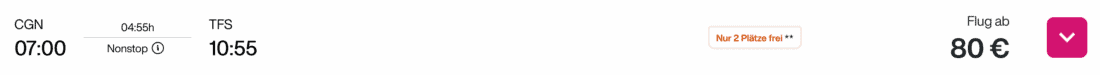 Die Kreuzfahrt startet auf Teneriffa und endet in Salvador da Bahia. Darum werden hier zwei Oneway-Flüge für die An- und Abreise benötigt. Für den Hinflug empfehlen wir euch die Direktverbindung von Köln nach Teneriffa mit Eurowings am 7. November 2024. Diesen Flug könnt ihr aktuell ab 80€ (zzgl. 29€ für 23 kg Aufgabegepäck) buchen: