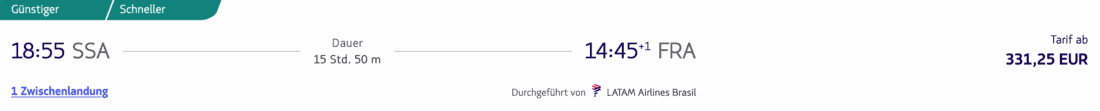 Nach Ankunft in Salvador gibt es verschiedene Optionen für den Rückflug. Ein günstiges Beispiel ist der Flug mit LATAM am 19. November 2024 nach Frankfurt, welcher aktuell ab 332€ (zzgl. 65€ für 23 kg Aufgabegepäck) buchbar ist:
