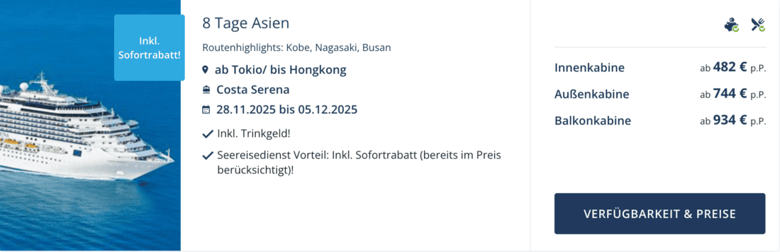 Die Costa Serena ist in der Wintersaison 2025/2026 auf verschiedenen Routen in Asien unterwegs. Aktuell könnt ihr dabei eine einwöchige Kreuzfahrt von Tokio nach Hongkong günstig buchen. Für die 7 Nächte in einer Innenkabine zahlt ihr 482€ pro Person. Falls euch diese Kabinenvariante nicht ausreicht, so könnt ihr euch auch für eine Außenkabine ab 744€ bzw. eine Balkonkabine ab 934€ (jeweils pro Person bei Doppelbelegung) entscheiden.