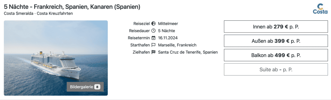 Die Costa Smeralda wird im November 2024 von Europa über Namibia und Kapstadt nach Dubai überführt, wo das Schiff dann während der kommenden Wintersaison im Einsatz sein wird. Aktuell sind auch verschiedene kürzere Teilstrecken günstig buchbar. So könnt ihr beispielsweise 5 Nächte von Marseille nach Teneriffa in einer Innenkabine bereits ab 279€ pro Person buchen. Ebenfalls verfügbar sind Außenkabinen ab 399€ sowie Balkonkabinen ab 499€ (jeweils pro Person bei Doppelbelegung).