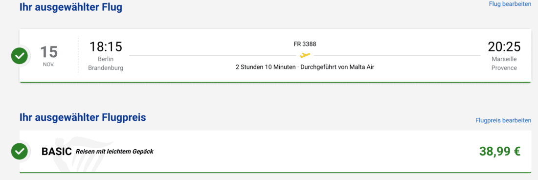 Die Kreuzfahrt startet in Marseille und endet auf Teneriffa. Deshalb sind zwei Oneway-Flüge erforderlich. Für die Anreise könnt ihr u.a. den Direktflug mit Ryanair von Berlin am 15. November 2024 buchen, welcher momentan ab 39€ (zzgl. 23€ für 20 kg Aufgabegepäck) verfügbar ist: