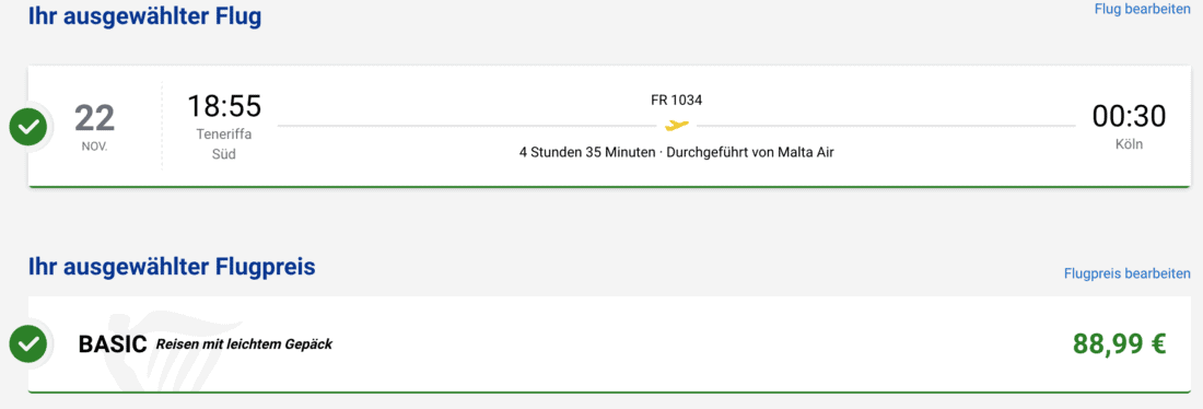 Für den Rückflug von Teneriffa könnt ihr beispielsweise die Verbindung mit Ryanair von Teneriffa nach Köln am 22. November 2024 buchen. Dieser Flug ist aktuell ab 89€ (zzgl. 37€ für 20 kg Aufgabegepäck) verfügbar: