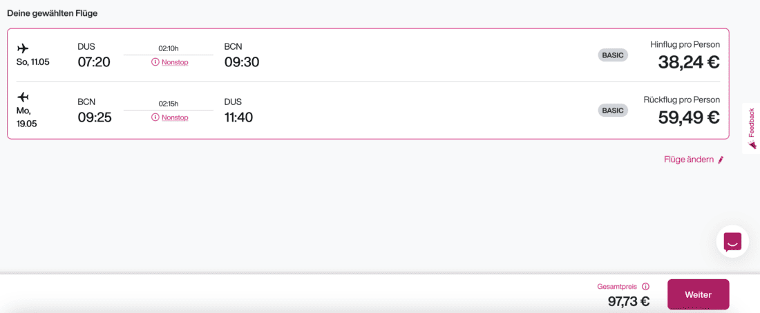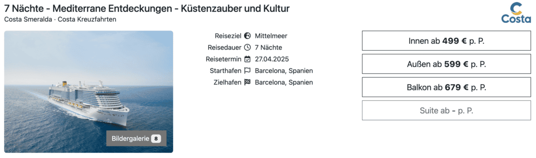 Die Kreuzfahrt startet und endet in Barcelona. Günstige Flüge für die Abfahrt am 11. Mai 2025 gibt es etwa mit Eurowings von Düsseldorf. Den Hin- und Rückflug könnt ihr euch momentan ab 98€ (zzgl. 60€ für 23 kg Aufgabegepäck) sichern: