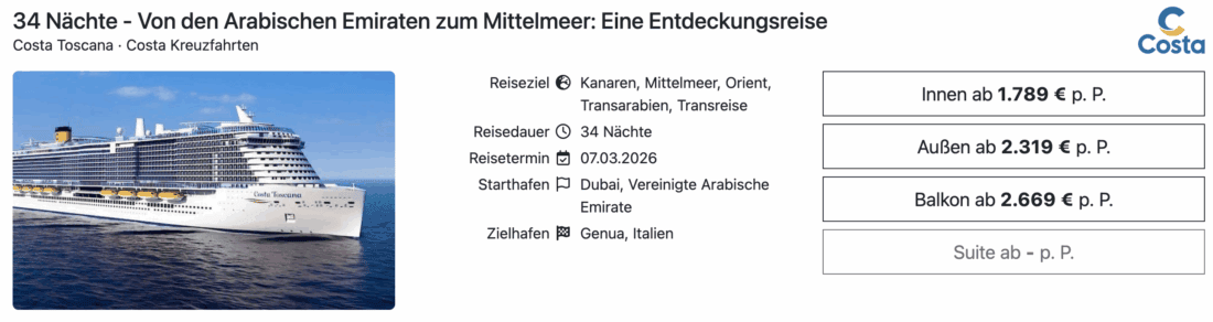 Die Costa Toscana fährt im März 2026 im Anschluss an ihre Wintersaison von Dubai zurück nach Europa und umrundet dabei den afrikanischen Kontinent. Costa hat nun auf den verschiedenen Teilstrecken sehr attraktive Preise geladen. So könnt ihr etwa die längste Kreuzfahrt nach Genua mit einer Dauer von 34 Nächten bereits ab 1.789€ pro Person in einer Innenkabine buchen. Weitere Optionen sind Außenkabinen ab 2.319€ sowie Balkonkabinen ab 2.669€ (jeweils pro Person bei Doppelbelegung). Alleinreisende sind ab 2.684€ mit von der Partie, was einem Aufpreis von 50% entspricht.
