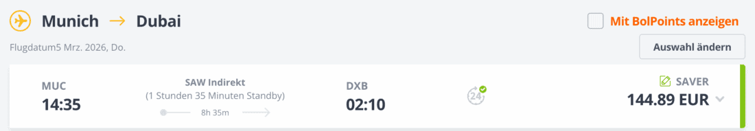 Die Kreuzfahrt startet in Dubai und endet in Genua. Einen günstigen Hinflug gibt es am 5. März 2026 mit Pegasus Airlines von München. Diesen Flug könnt ihr momentan ab 145€ (inklusive 20 kg Aufgabegepäck) buchen:
