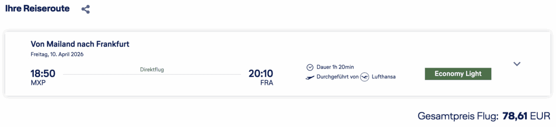 Nach Ankunft in Genua gibt es verschiedene Möglichkeiten für die Rückreise. Am günstigsten sind in der Regel Flüge von Mailand, die ihr etwa mit Lufthansa nach Frankfurt ab 79€ (zzgl. 40€ für 23 kg Aufgabegepäck) buchen könnt: