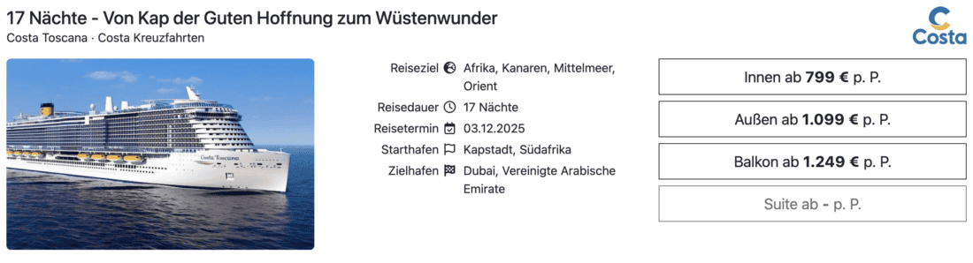 Die Costa Toscana, das aktuell neueste Schiff in der Flotte der italienischen Reederei Costa, wird in der kommenden Wintersaison auf einwöchigen Kreuzfahrten im Orient eingesetzt. Aktuell könnt ihr in diesem Zusammenhang die Positionierung von Kapstadt nach Dubai zum günstigen Preis buchen.