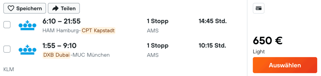 Die Kreuzfahrt startet in Dubai und endet in Kapstadt. Für die An- und Abreise sind in diesem Fall also Gabelflüge notwendig. Ein Beispiel sind Flüge mit KLM mit Hinflug am 2. Dezember ab Hamburg und Rückflug am 21. Dezember 2025 nach München. Diese Kombination ist momentan ab 650€ (zzgl. 115€ für 23 kg Aufgabegepäck) buchbar: