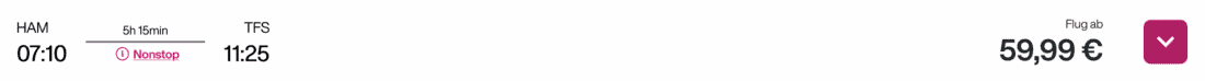 Die Kreuzfahrt startet auf Teneriffa und endet in Dubai. Für die Anreise könnt ihr beispielsweise am 20. November 2025 den Direktflug von Hamburg nach Teneriffa mit Eurowings nutzen. Dieser ist aktuell ab 60€ (zzgl. 32€ für 23 kg Aufgabegepäck) buchbar: