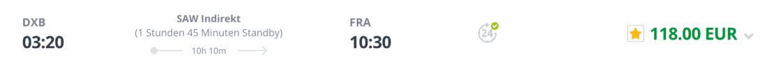 Nach Ankunft in Dubai gibt es sehr viele Optionen für euren Rückflug. Eine günstige Variante ist der Flug mit Pegasus Airlines nach Frankfurt am 21. Dezember 2025. Diesen könnt ihr ab 118€ (zzgl. 32€ für 20 kg Aufgabegepäck) buchen:
