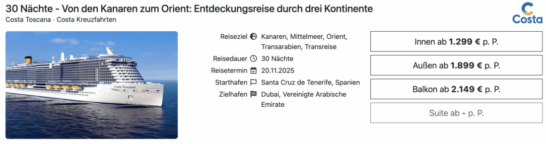 Besonders günstig ist dabei aktuell die Teilstrecke von Teneriffa nach Dubai. Für 30 Nächte in einer Innenkabine zahlt ihr nur 1.299€ pro Person. Weitere Optionen sind Außenkabinen ab 1.899€ sowie Balkonkabinen ab 2.149€ (jeweils pro Person bei Doppelbelegung). Für Alleinreisende gilt dieses Angebot leider nicht.