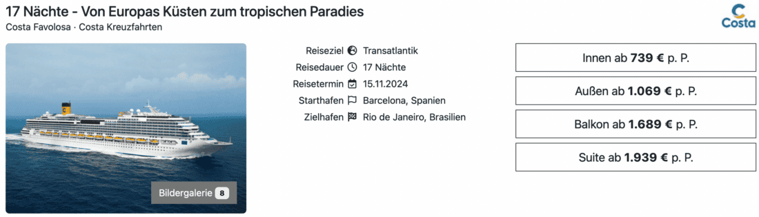 Die Costa Favolosa wechselt im November 2024 ihr Einsatzgebiet und wird deshalb von Barcelona nach Rio de Janeiro überführt. Aktuell könnt ihr diese Transatlantikkreuzfahrt mit einer Dauer von 17 Nächten günstig buchen. Eine Innenkabine ist auf dieser Route bereits ab 739€ pro Person verfügbar. Falls ihr etwas mehr Luxus genießen möchtet, dann sind die Außenkabinen ab 1.069€ die richtige Option, während Balkonkabinen ab 1.739€ (jeweils pro Person bei Doppelbelegung) buchbar sind. Für Alleinreisende gilt das Angebot nicht.