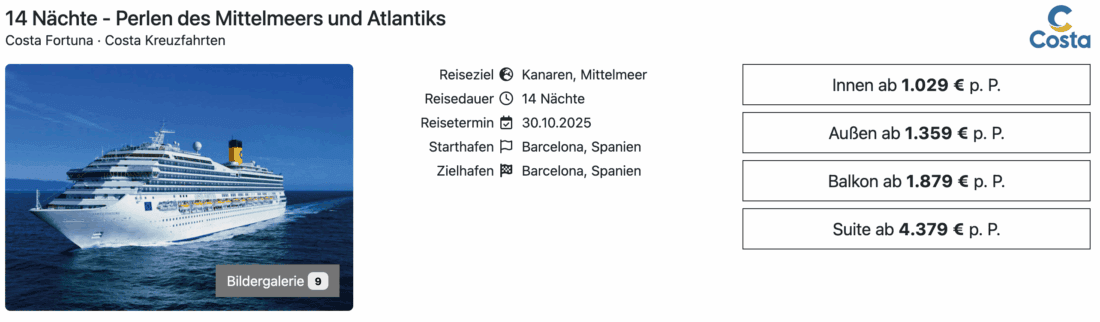 Die Costa Fortuna wird mit Abfahrt Ende Oktober 2025 auf einer zweiwöchigen Kreuzfahrt ab Barcelona eingesetzt und steuert dabei neben mehreren Zielen im Mittelmeer auch verschiedene Inseln im Atlantik an. Es geht dabei für euch u.a. nach Madeira und La Palma.