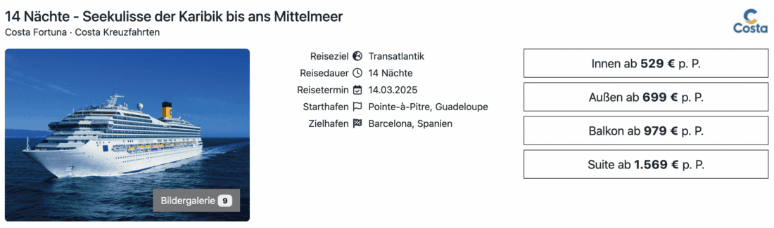 Die Costa Fortuna verlässt im März 2025 die Karibik und wird für die kommende Sommersaison zurück ins Mittelmeer überführt. Ihr könnt auf dieser Kreuzfahrt von Guadeloupe nach Barcelona günstig mit dabei sein, denn für 14 Nächte in einer Innenkabine zahlt ihr lediglich 529€ pro Person. Gegen Aufpreis sind zudem Außenkabinen ab 699€ sowie Balkonkabinen ab 979€ (jeweils pro Person bei Doppelbelegung) verfügbar. Für Alleinreisende sind alle Kategorien ohne Einzelzuschlag buchbar.