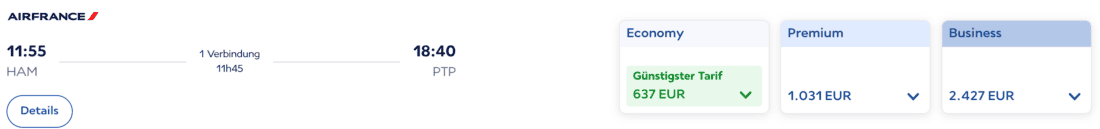 Deutlich günstiger wird das Ganze, wenn ihr von Paris abfliegt. In diesem Fall werden für einen Direktflug lediglich 387€ (zzgl. 50€ für 23 kg Aufgabegepäck) fällig.