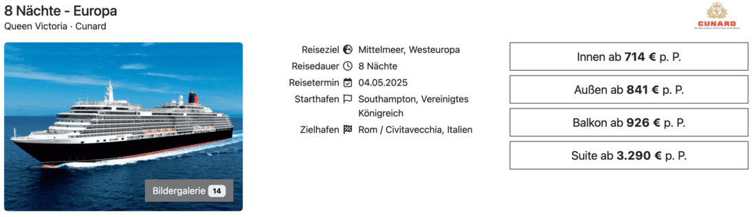 Bitte beachtet, dass die oben genannten Preise und Verfügbarkeiten in den jeweiligen Kategorien dem Stand vom 23. Dezember 2024 entsprechen. Bei Cunard gibt es immer mal wieder Schwankungen, sodass einzelne Kategorien vorübergehend nicht verfügbar sind oder nur in Form einer Warteliste angefragt werden können.