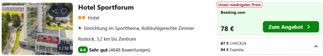 Das Hotel Sportforum ist eines der günstigeren Hotels in meiner Heimatstadt und gehört keiner Kette an. Möchte man vom 20. bis 21. August dort übernachten, beträgt der beste Preis laut Trivago 78€. Die Flex-Rate würde laut Trivago 87€ kosten, bei Expedia gibt es sie für 82€ mit Mitglieder-Rabatt: